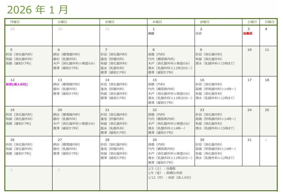2025/12/26 外来診療 1月外来診療担当医のご案内 2026年1月の外来診療担当医のご案内です。 担当医は予告なく変更になる場合がございます。予めご了承いただきますようお願いいたします。 病院長 前の記事へ 記事一覧へ 次の記事へ ホーム お知らせ 1月外来診療担当医のご案内