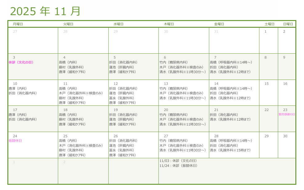 2025/10/31 外来診療 11月外来診療担当医のご案内 11月の外来診療担当医のご案内です。 担当医は予告なく変更になる場合がございます。予めご了承いただきますようお願いいたします。 病院長 前の記事へ 記事一覧へ ホーム お知らせ 11月外来診療担当医のご案内