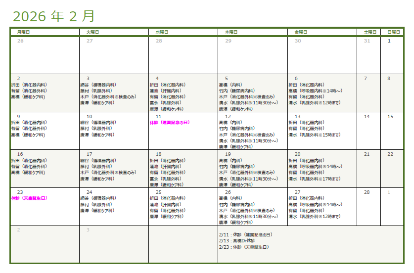 2026/02/01 外来診療 2月外来診療担当医のご案内 2026年2月の外来診療担当医のご案内です。 担当医は予告なく変更になる場合がございます。予めご了承いただきますようお願いいたします。 病院長 前の記事へ 記事一覧へ ホーム お知らせ 2月外来診療担当医のご案内
