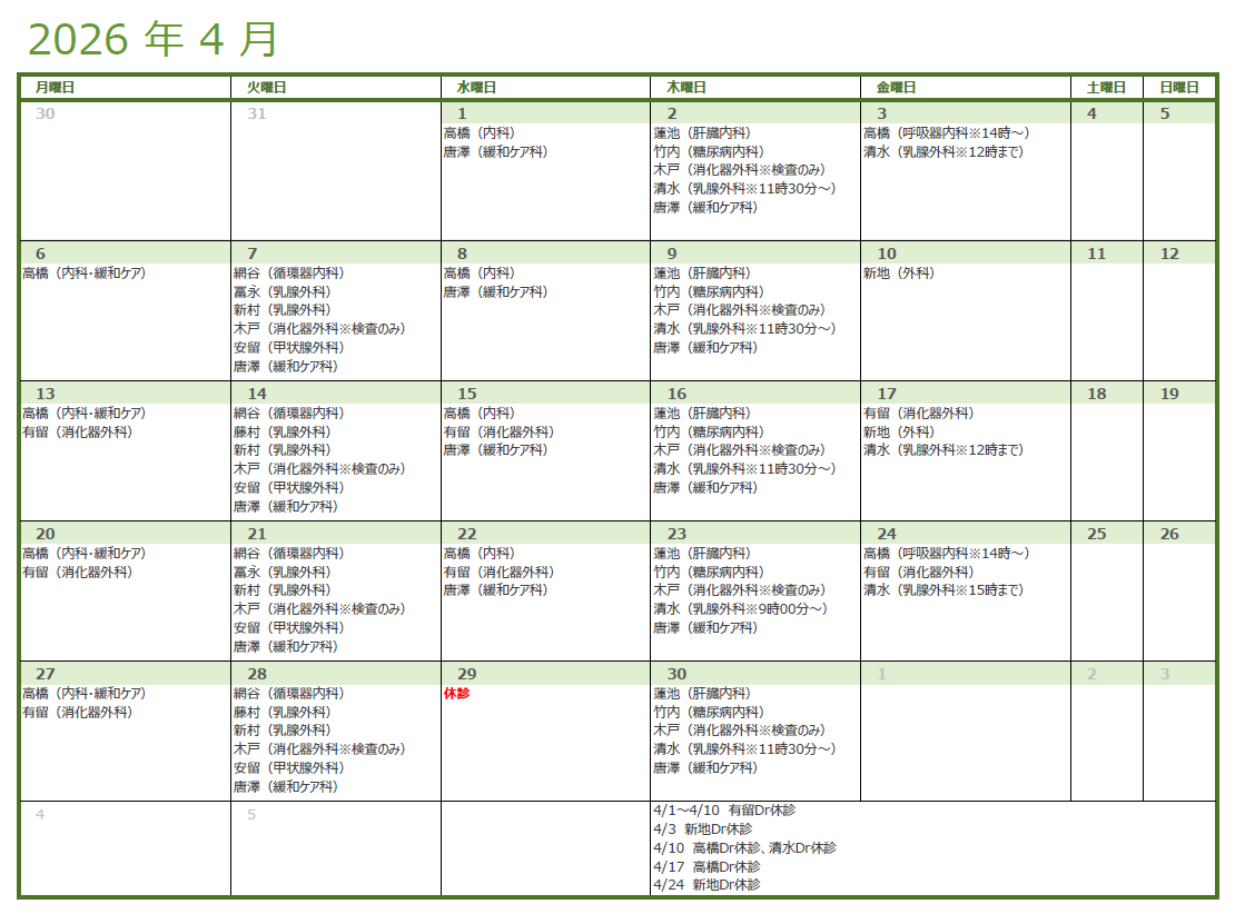 2026/04/01 外来診療 4月外来診療担当医のご案内 2026年4月の外来診療担当医のご案内です。 担当医は予告なく変更になる場合がございます。予めご了承いただきますようお願いいたします。 病院長 前の記事へ 記事一覧へ ホーム お知らせ 4月外来診療担当医のご案内